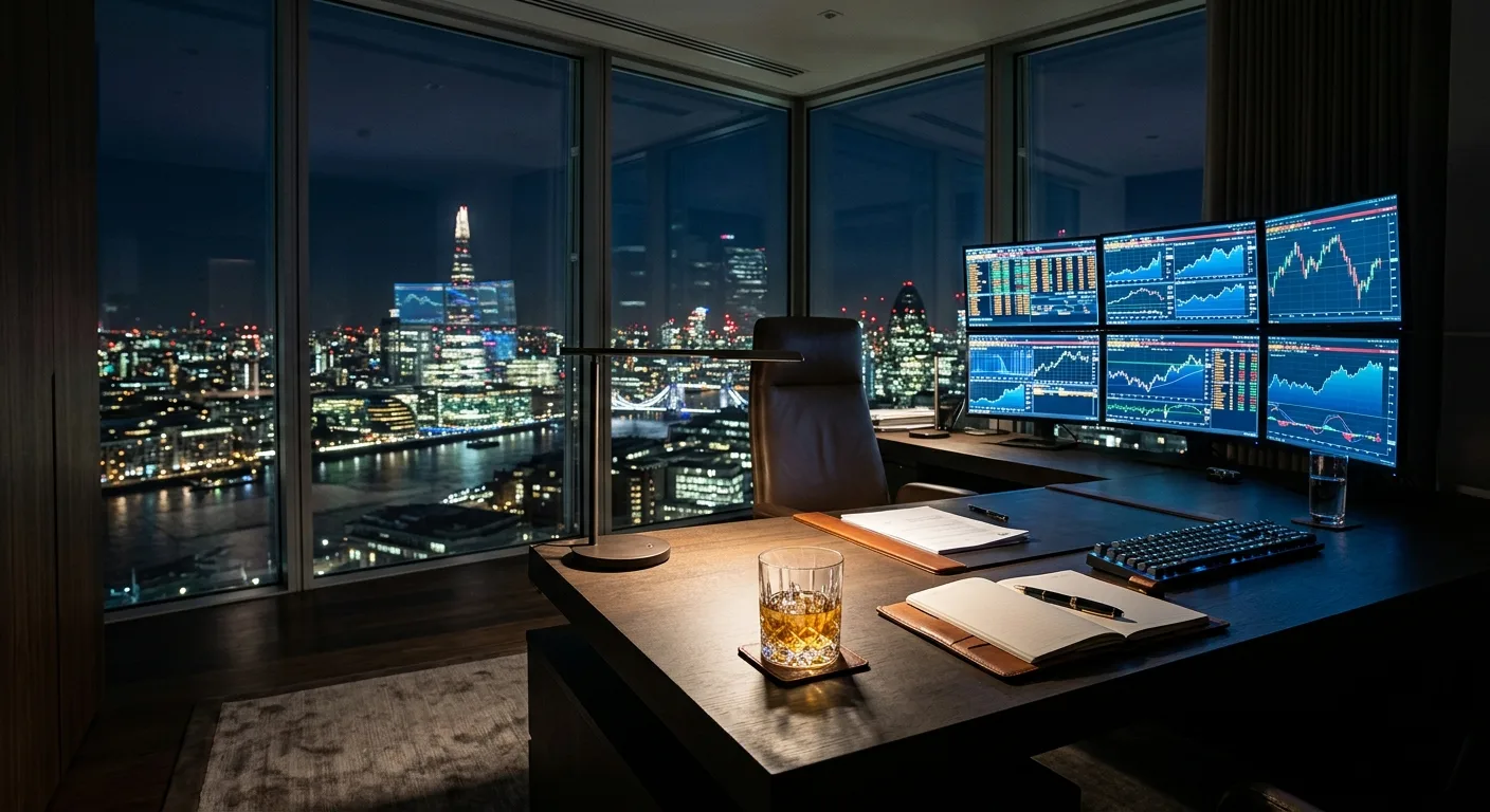 A high-rise office at night with a city view, multiple trading screens, and a drink on the desk.