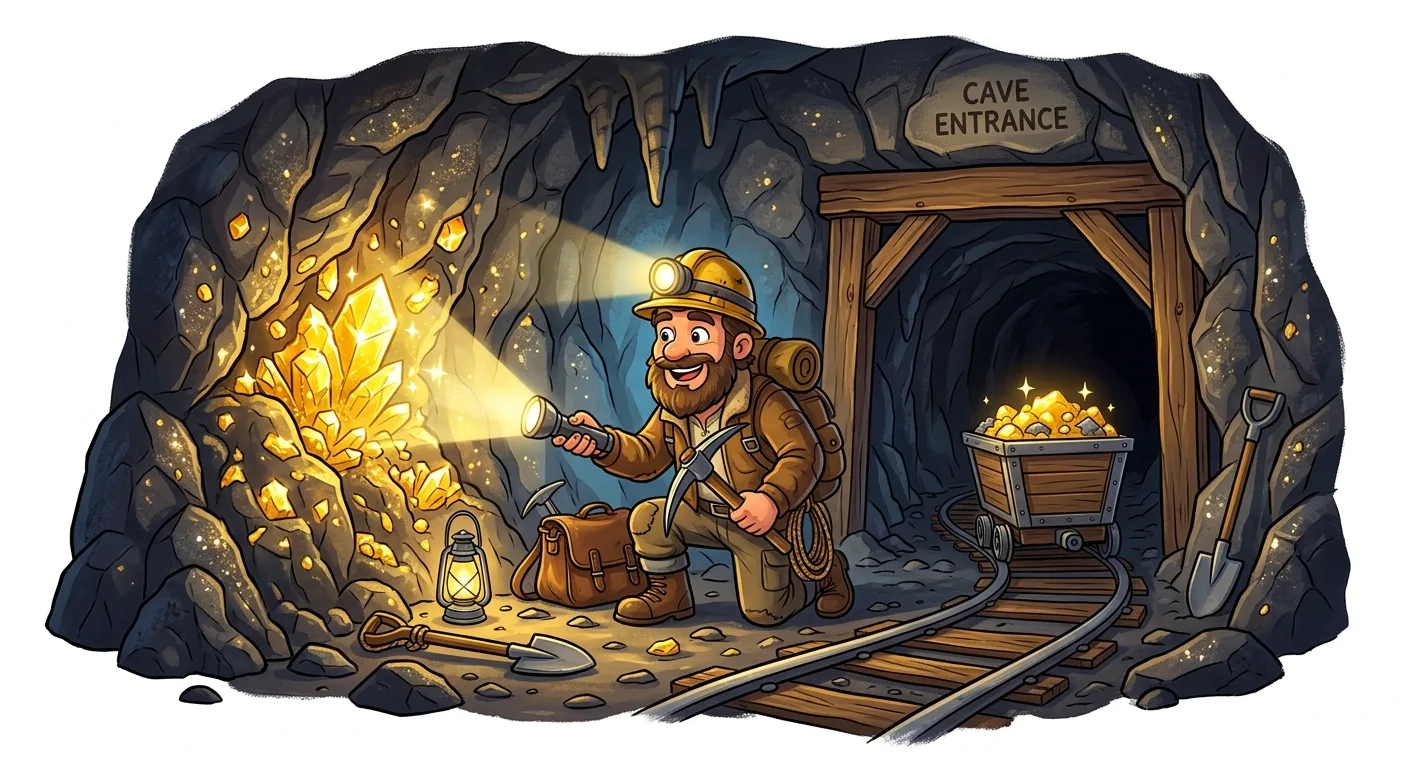 A cartoon miner explores a cave filled with glowing gold crystals and a cart of gold.