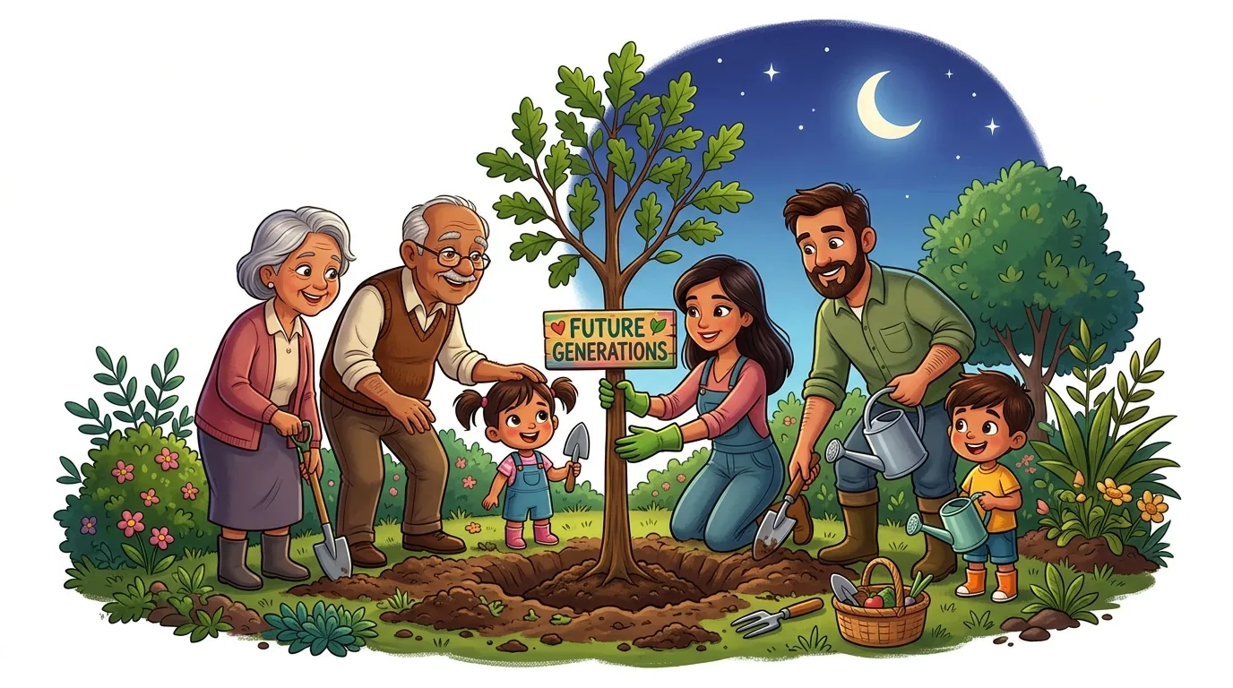 A multi-generational family plants a tree with a sign reading "Future Generations."