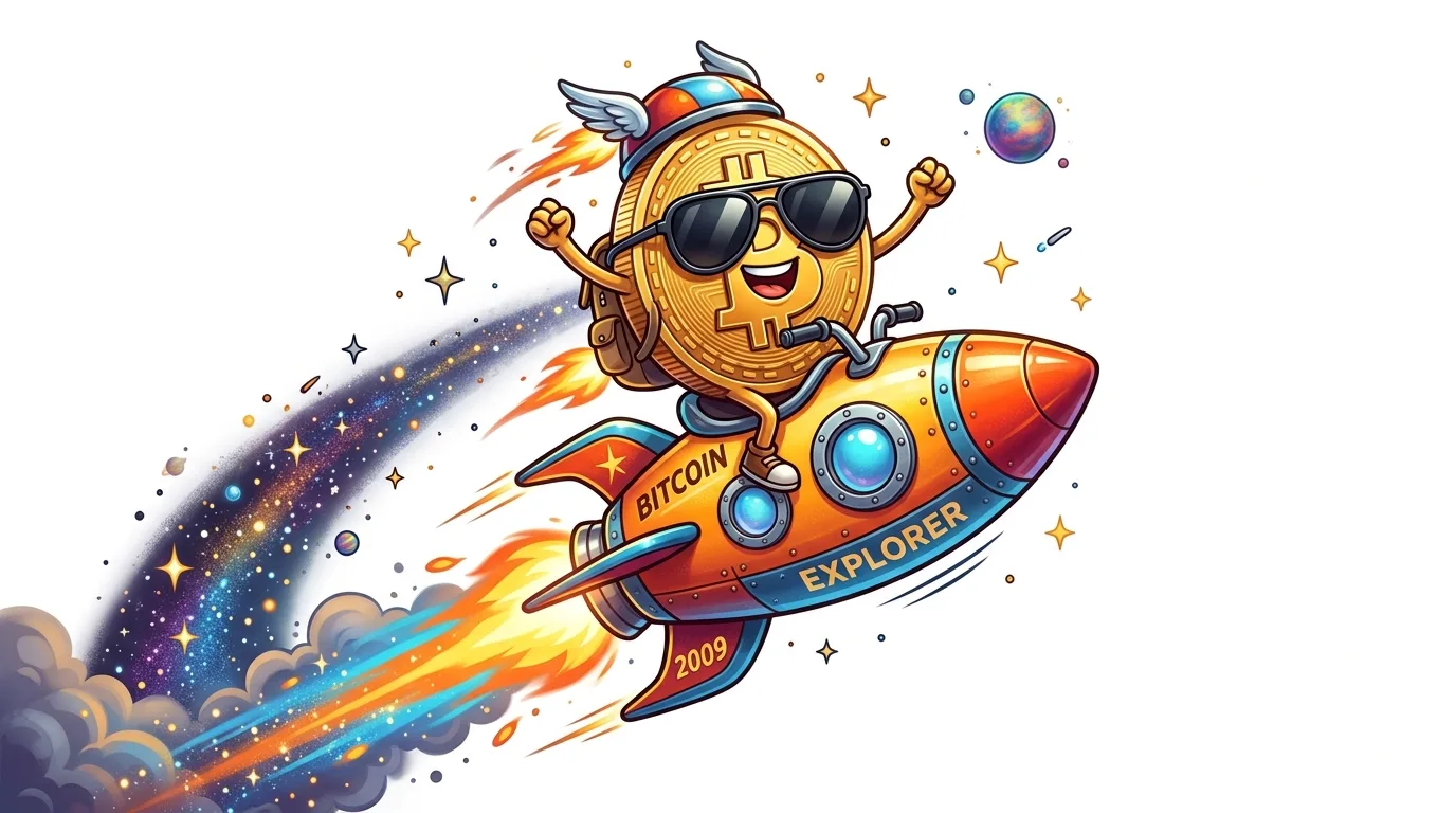 A cartoon Bitcoin character in sunglasses rides a rocket, leaving a trail of stars and fire.