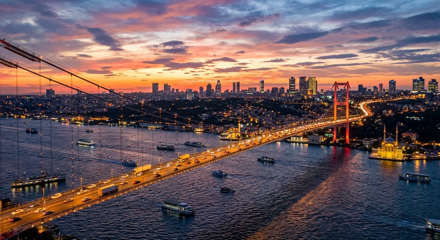 A vibrant sunset over the Bosphorus Bridge in Istanbul, with city lights and boats.