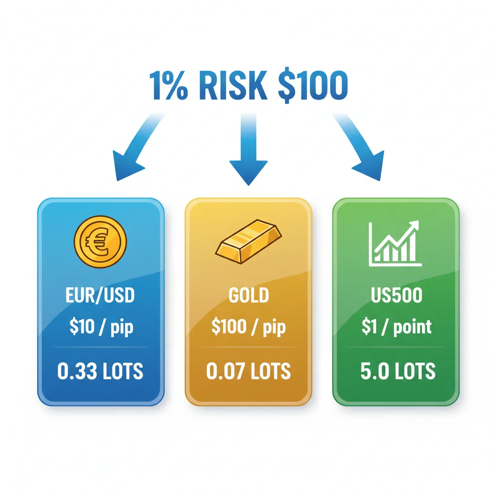 - ✓Différents instruments nécessitent des tailles de lot différentes pour maintenir le même risque en dollars par trade