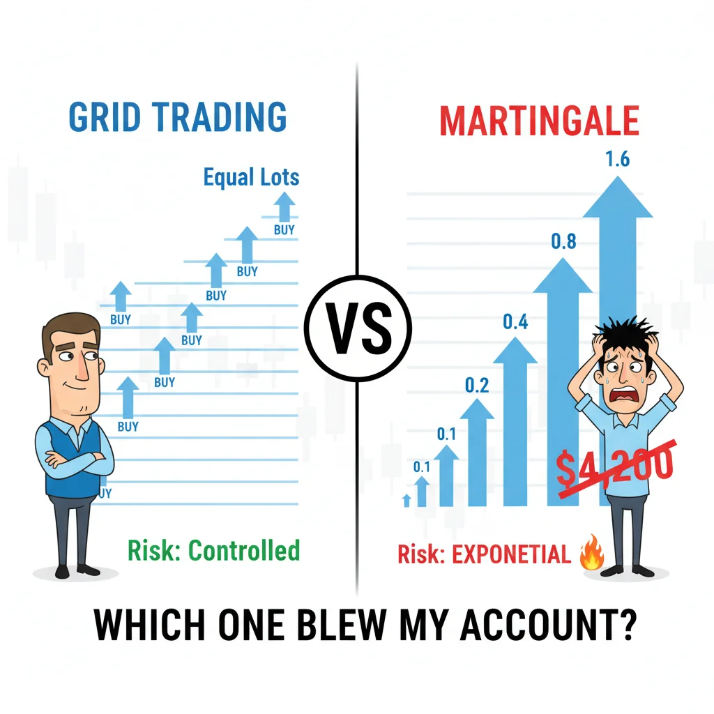 La maggior parte dei trader che fanno saltare i propri conti non lo fanno con ingressi sbagliati. Lo fanno con strategie di dimensionamento delle posizioni che sembrano denaro facile finché non lo sono più. Sia il grid trading che la martingala promettono profitti costanti nei mercati in range, ma una di esse ha distrutto un mio conto da $4.200 nel 2019, e ti mostrerò esattamente il perché prima che questo articolo sia finito.