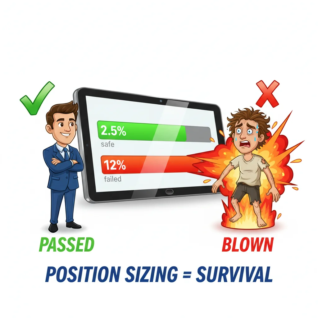Kadar kemenangan 68% tidak bermakna apa-apa jika satu dagangan bersaiz besar menghapuskan had kerugian harian anda. Dalam cabaran firma prop, saiz posisi adalah kelangsungan hidup.