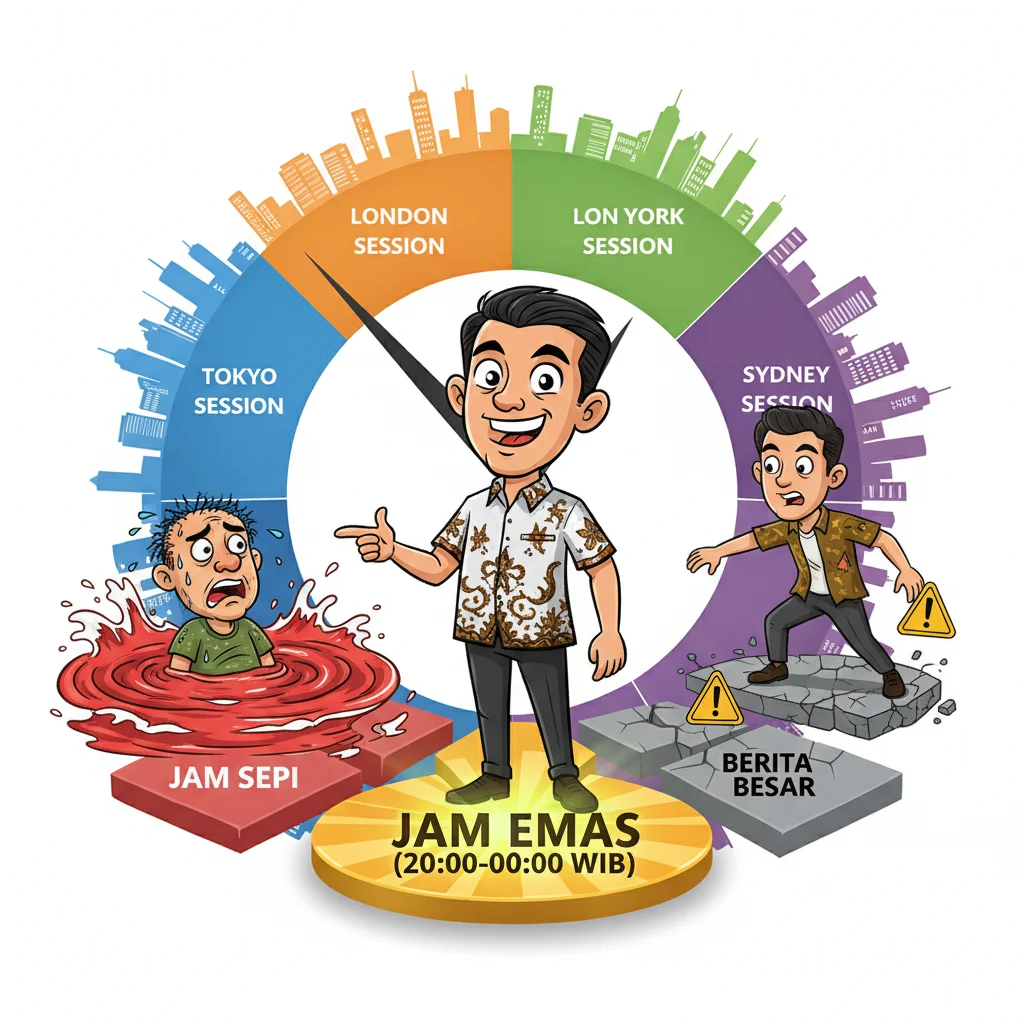 Di grup-grup trading Indonesia, saya sering lihat mitos yang sama berulang: 'forex buka 24 jam, jadi kapan saja bisa trading dengan hasil yang sama.' Ini salah besar. Jam trading forex memang buka hampir 24 jam sehari, tapi bukan berarti semua jam punya kualitas yang sama. Ada jam di mana spread melebar sampai 3x lipat, volume sepi kayak warung malam hujan, dan sinyal palsu bertebaran ke mana-mana. Saya pernah kehilangan Rp 4,2 juta dalam satu malam hanya karena trading di jam yang salah, pair yang biasanya jinak tiba-tiba bergerak liar tanpa alasan jelas. Artikel ini akan kasih kamu tabel waktu konkret berdasarkan WIB, bukan teori kosong.